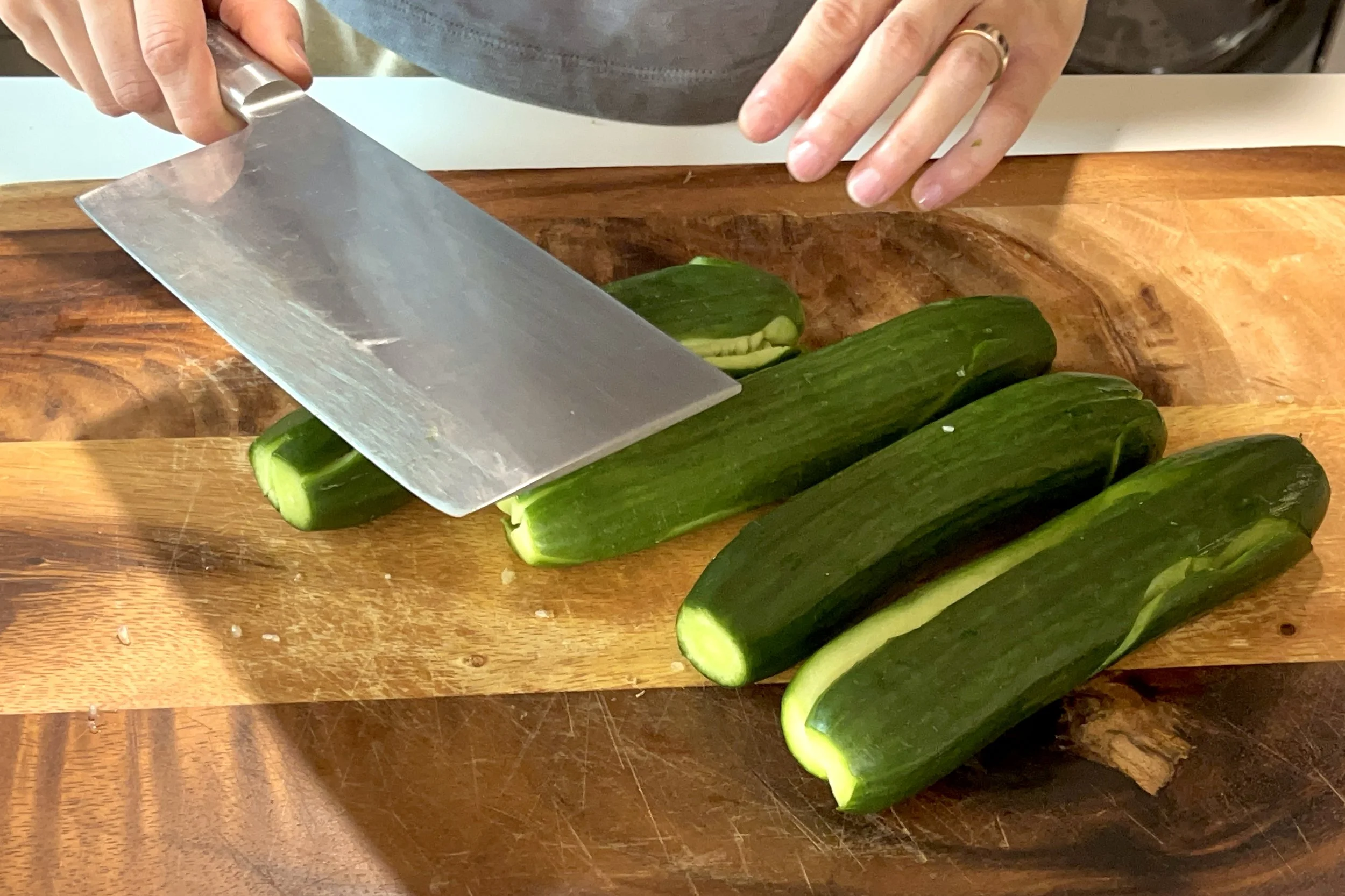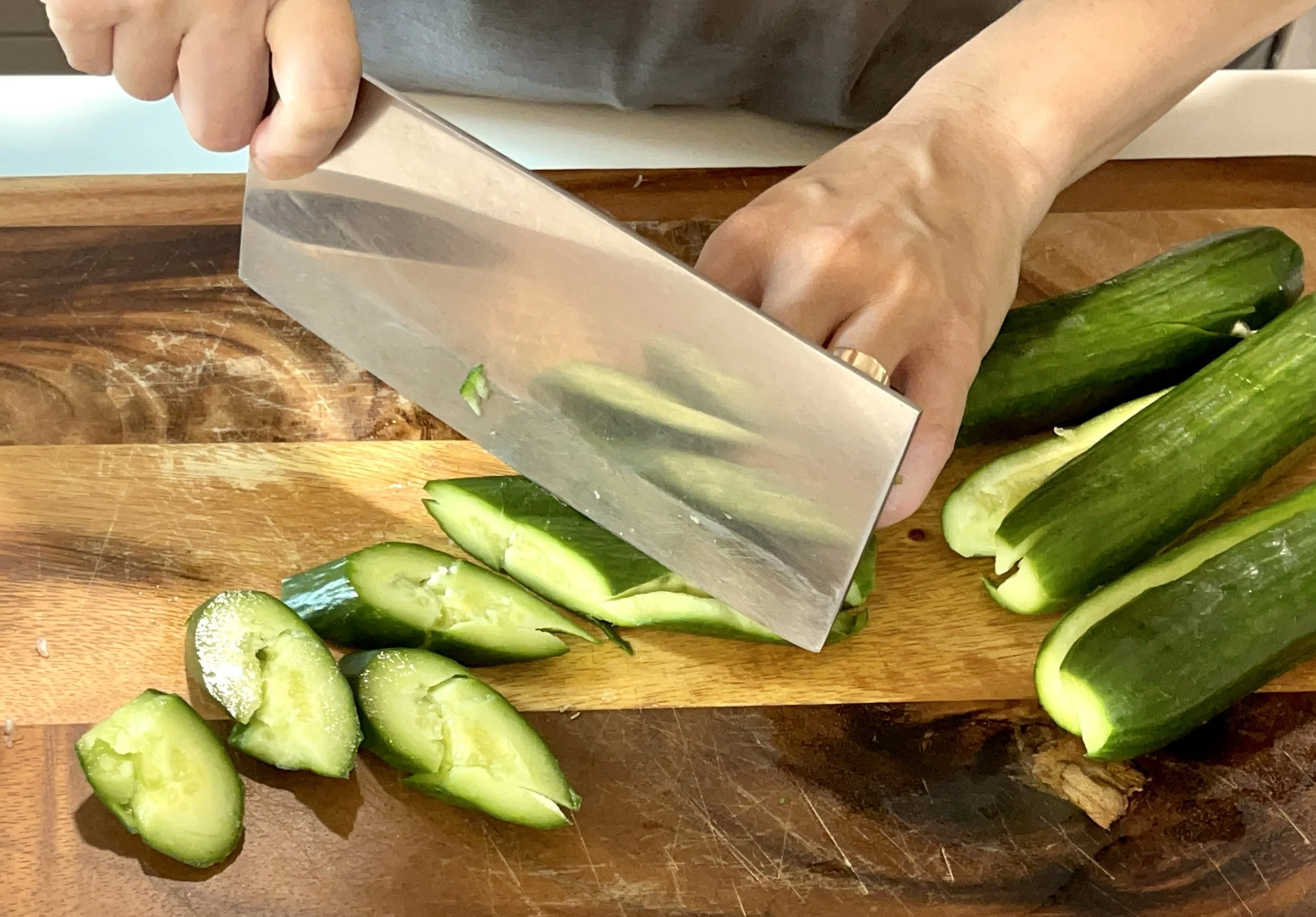 If you have a knife with narrow blade, use the palm of the other hand to assist. Lay the flat side of the blade on top of the cucumber with blade side facing away. Hold the other hand in the air, palm side facing down. Hit the blade confidently, using mainly the bottom of the palm. This will also crack the cucumbers easily.