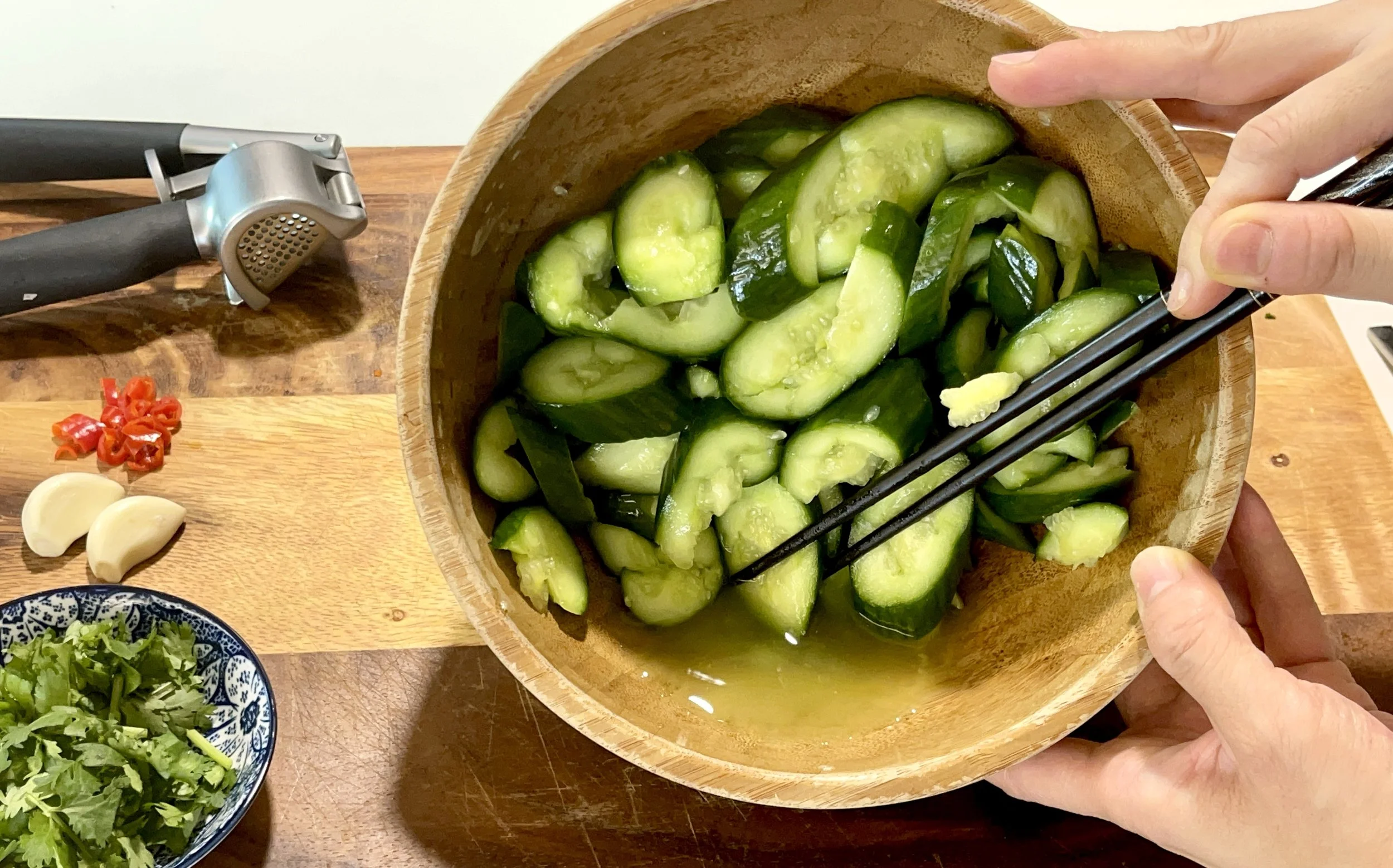 A large variety of cucumbers can be found in the market nowadays, whether locally grown or imported. Most of these cucumbers are good for this particular salad, like Chinese cucumbers, Persian cucumbers, Japanese cucumbers or English cucumbers. I only recommend not to use cucumbers with thick skin. Thick skin is not ideal for flavour absorption. Presentation wise, you would prefer to retain some skin for its dark green colour, otherwise the dish looks pale.