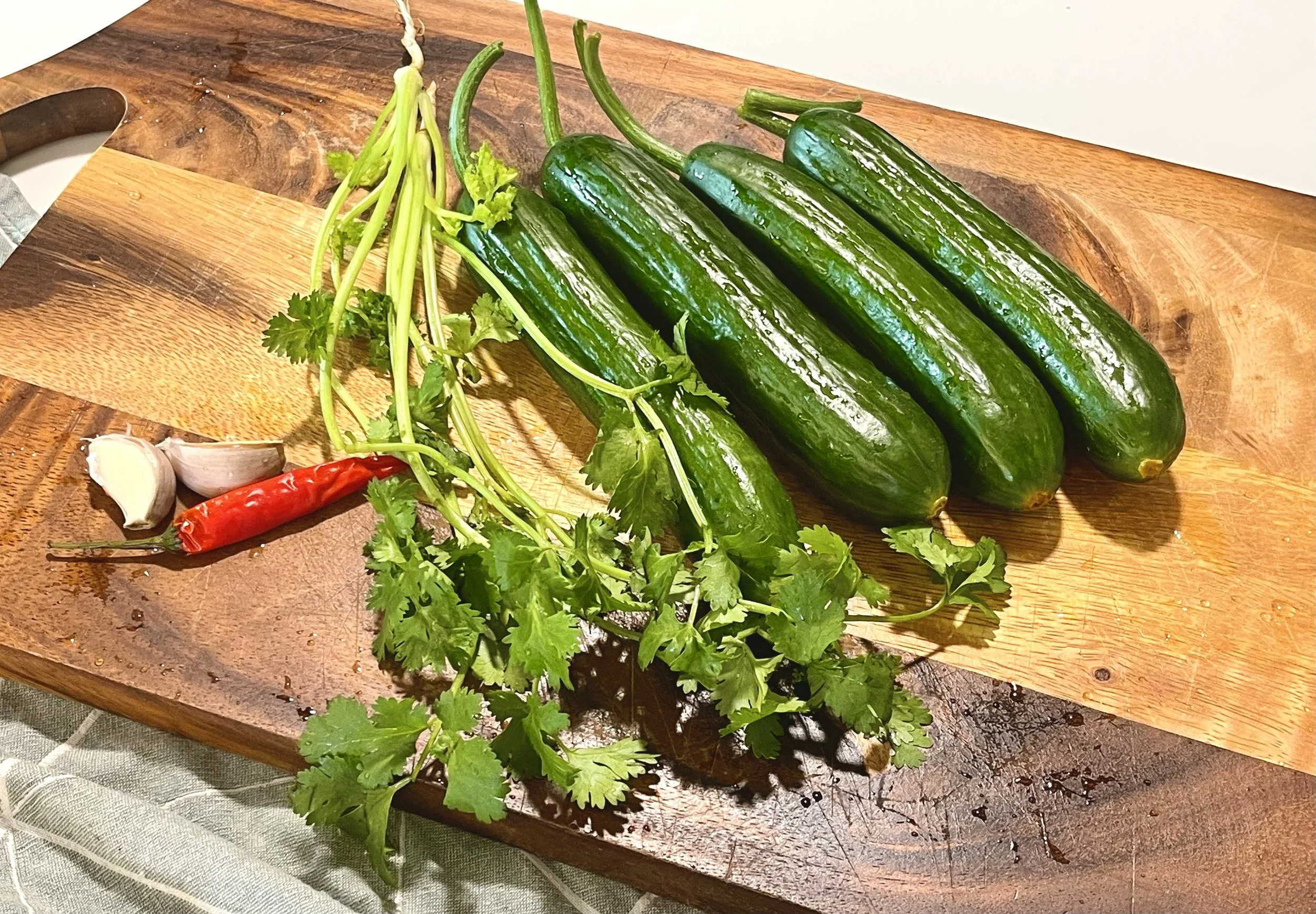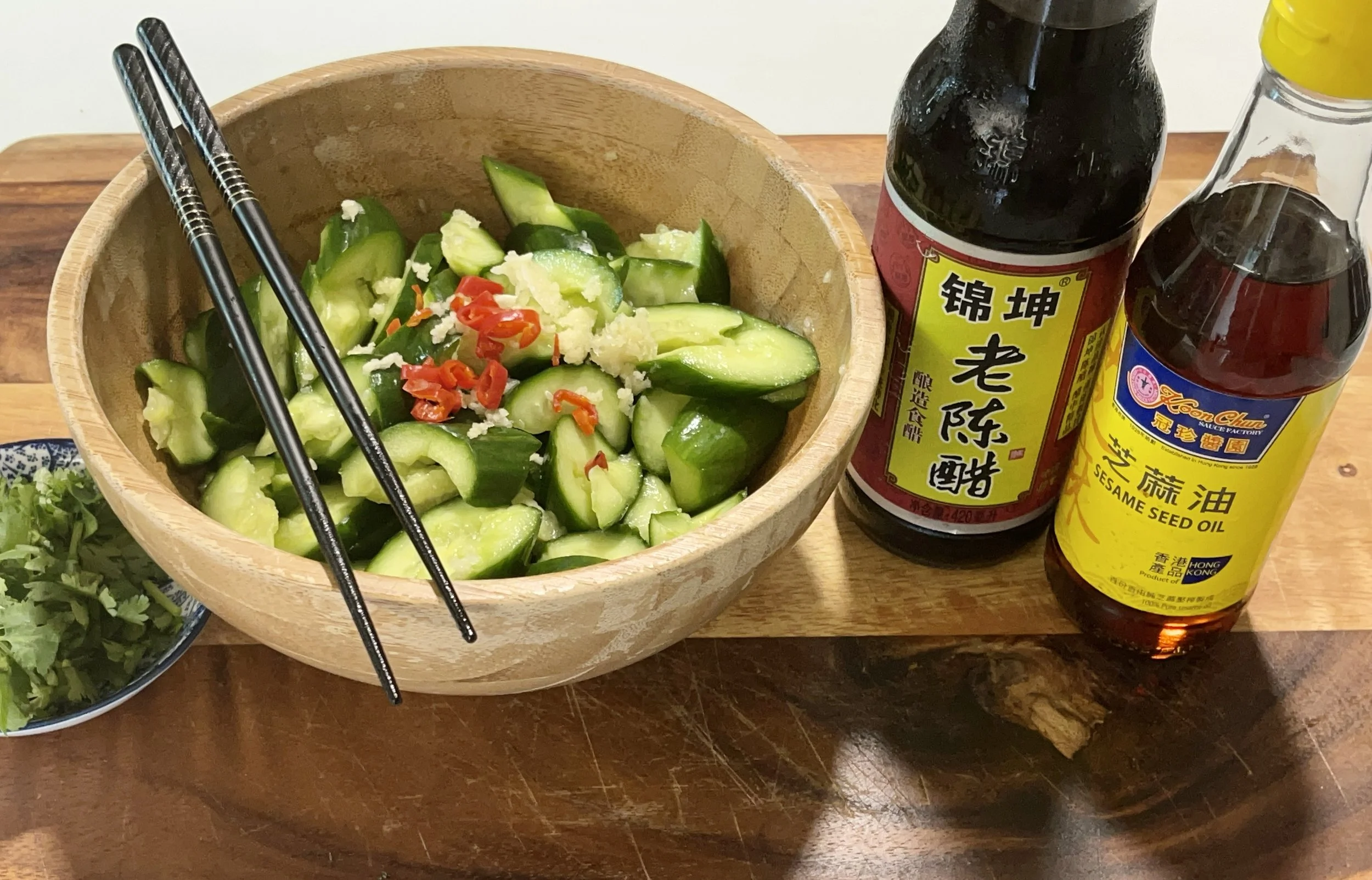 It's difficult to find out where Cucumber Salad was originated from. Salad type of dishes are called “cold mix” in Chinese, so this dish, if literally translated, would be named “Cold Mixed Cucumber”. The unique method of smashing the cucumbers before cutting however, originates from North Eastern China, a region known for its freezing Winters. Why smash instead or cutting? First, smashing will get rid of some of the seeding part, which is very watery and dilutes the dressing. Second, smashing releases some juice from the squash part of the cucumber, enhancing fragrance and flavour. Lastly, cutting leaves clean edges and smooth surfaces, whilst smashing leaves rough edges that create more contacts for the absorption of dressing.