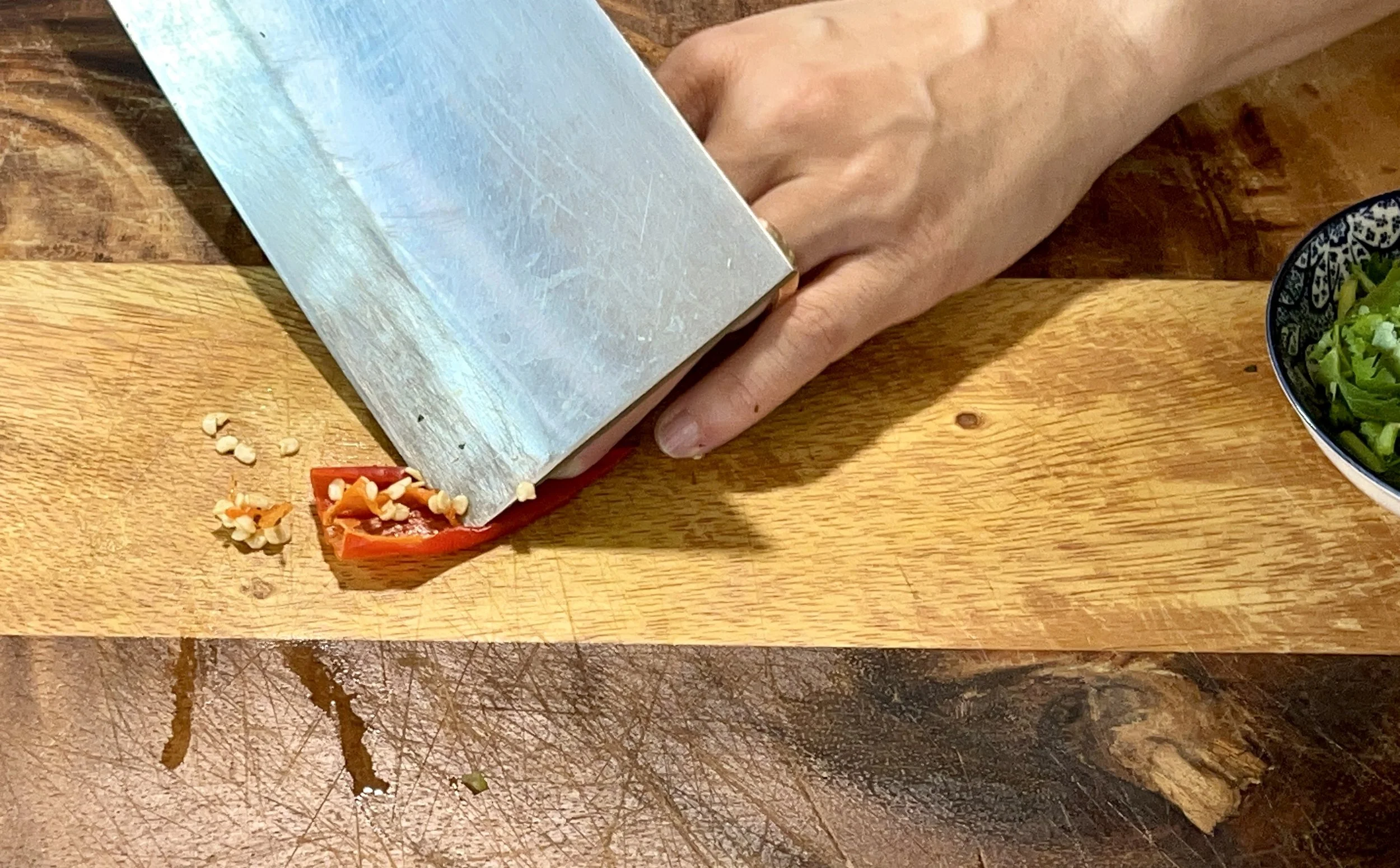 4. Scrape away the seeds of red chilli and chop to 5mm long pieces.