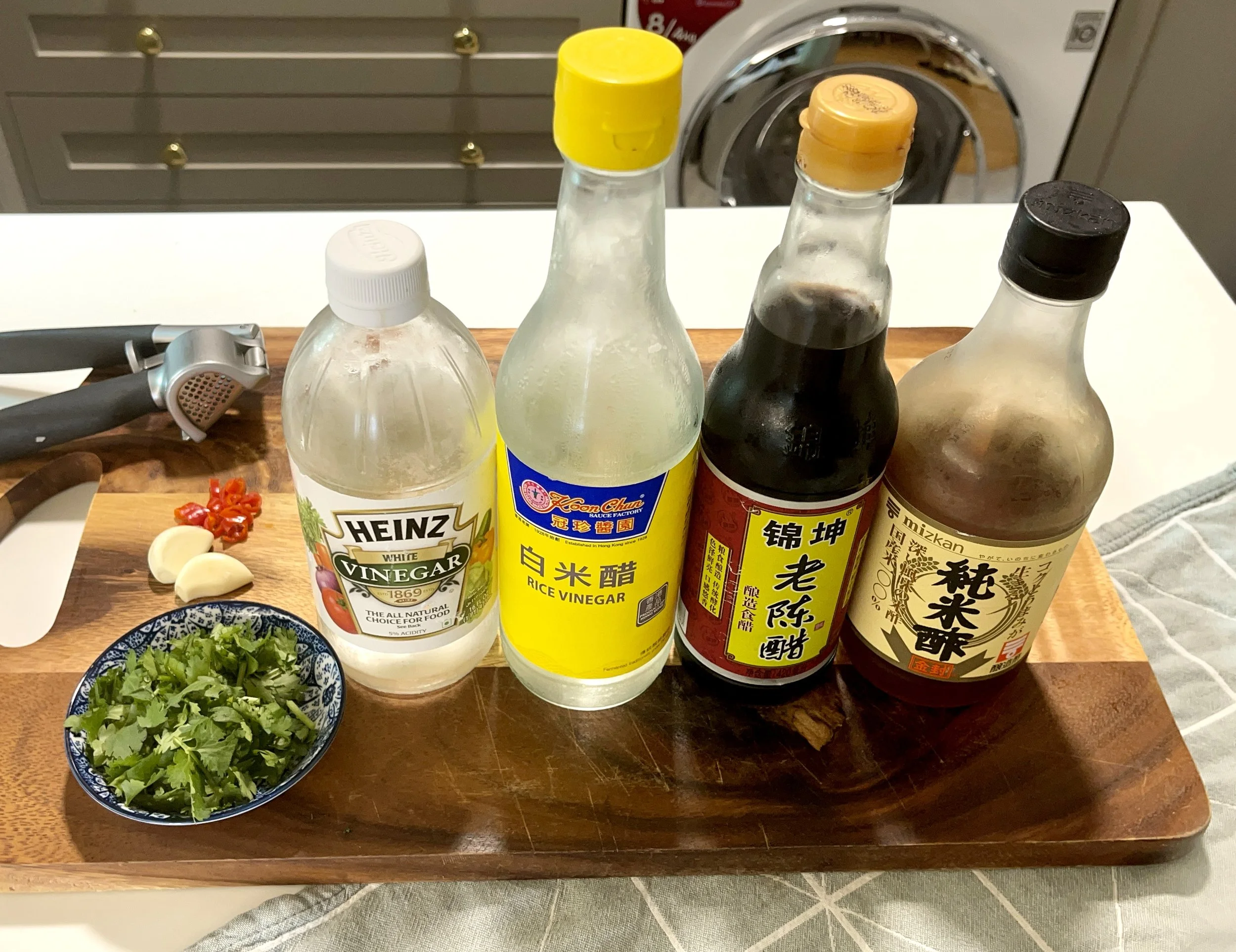 Which type of vinegar to use? For this dish, dark vinegar is preferred. At least this is what my Grandma used for her cucumber salad recipe. White or rice vinegar can also be used as substitutes. Their acidity is crisp and high, tasting more sour. It pairs perfectly with spiciness as a moderating ingredient. Also, the original colors of the ingredients are unaltered because they are transparent. However in this salad, dark vinegar deepens and enhances the green colour. Also compared to white vinegar, dark vinegar’s acidity is more layered with saltiness and fragrance. I found it especially pairs well with garlic and sesame oil. Below are some typical white and dark vinegars used in Chinese cooking. There are too many brands. These are just what I have in the kitchen.
