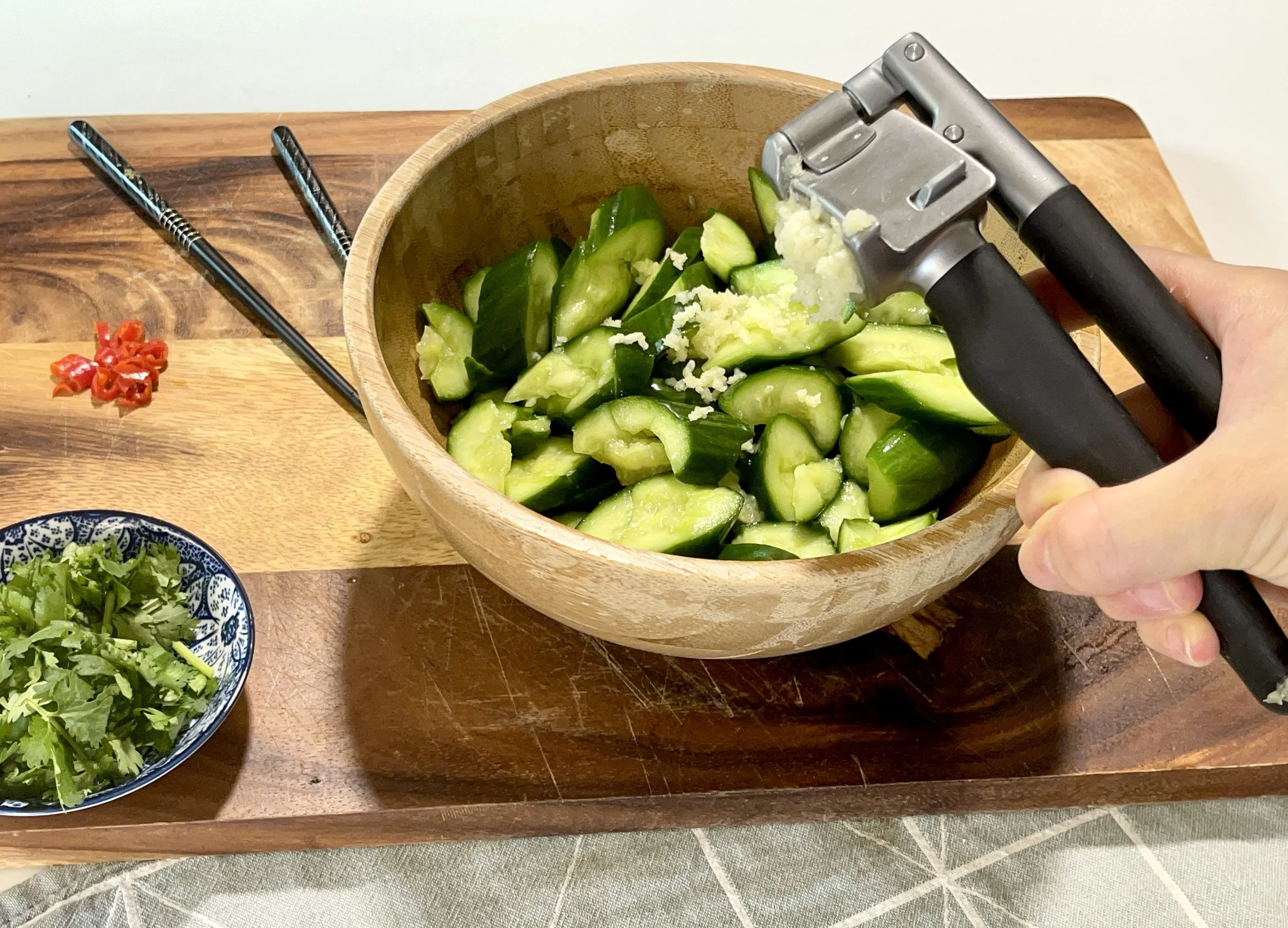 There is NO need to hold the cucumber to stabilise it. You don’t want any part of the hand to be near or under the blade during smashing. The smashing movement is quite swift, so the cucumber doesn't really move around much.