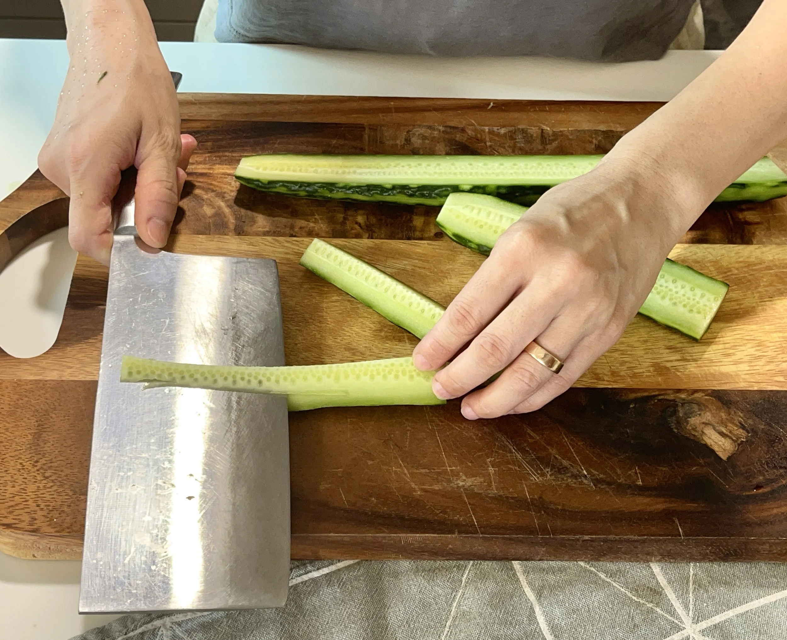 If using larger cucumbers, cut instead of smash: Persian cucumbers have very thin skin and little seeds. If using a longer cucumber with more seeds, first peel partial of the skin by leaving stripes of the skin on to enhance presentation.