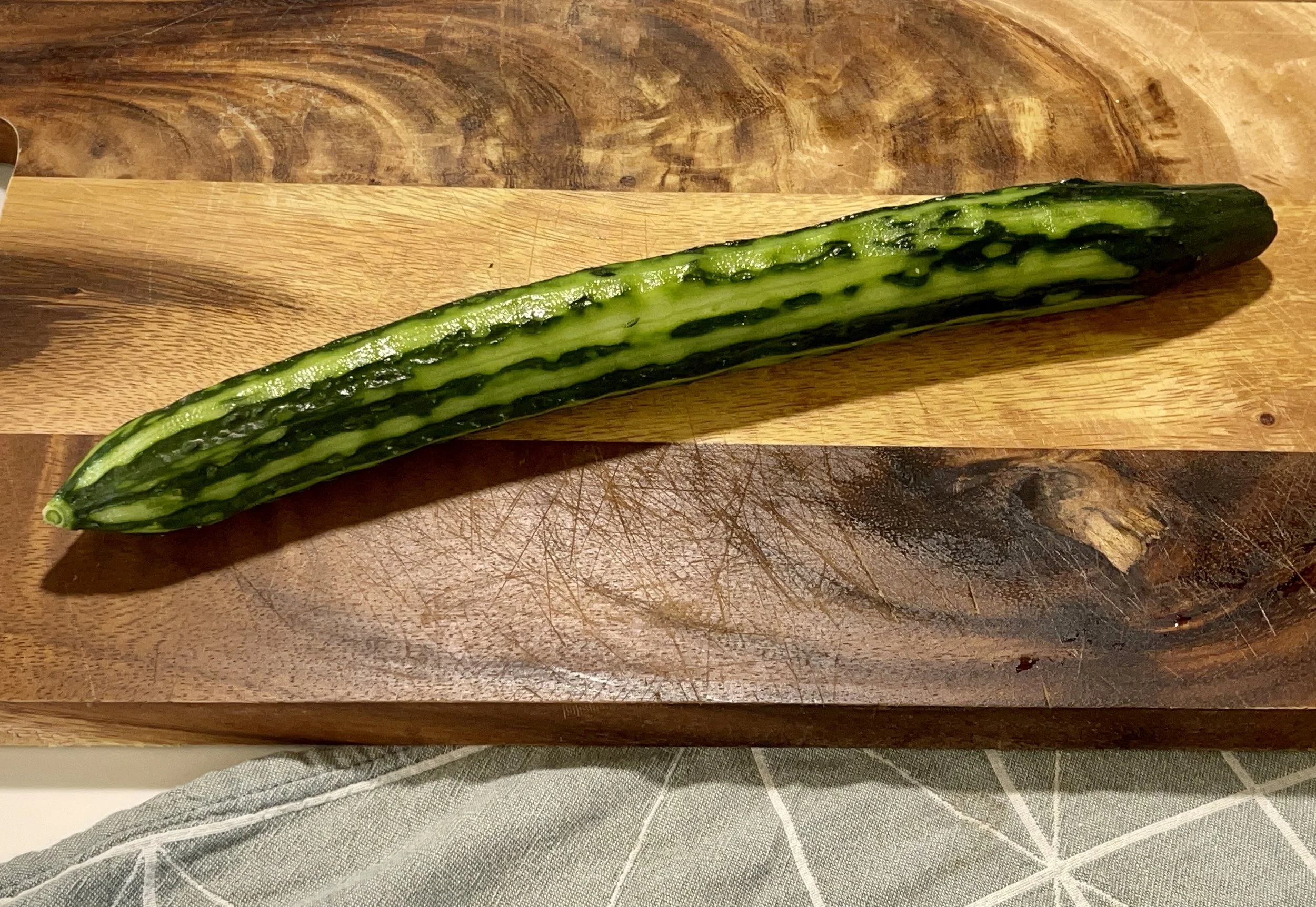 Hold the knife flat with the unsharpened edge close to yourself and sharp edge away from yourself. The flat surface of the blade is placed parallel to the cucumber. Smash confidently, the cucumber will break and juice will splash, so wear an apron and clear out the countertop. Repeat till the whole cucumber is cracked. It’s not necessary to smash till the cucumber splits into pieces. As long as it’s cracked, it’ll break easily when cutting (next step).