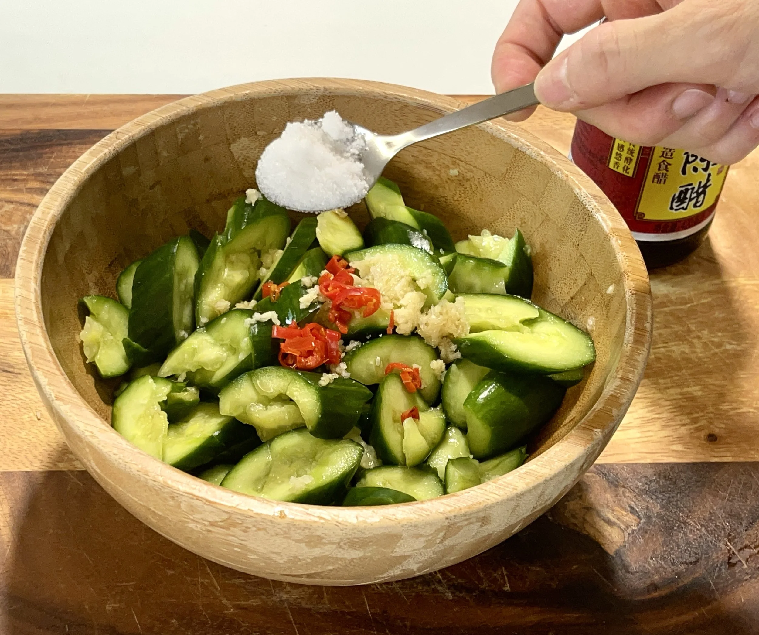 7. Add pressed or minced garlic, red chilli, sugar, rest of salt, vinegar, sesame oil. Mix thoroughly but avoid breaking the cucumber.