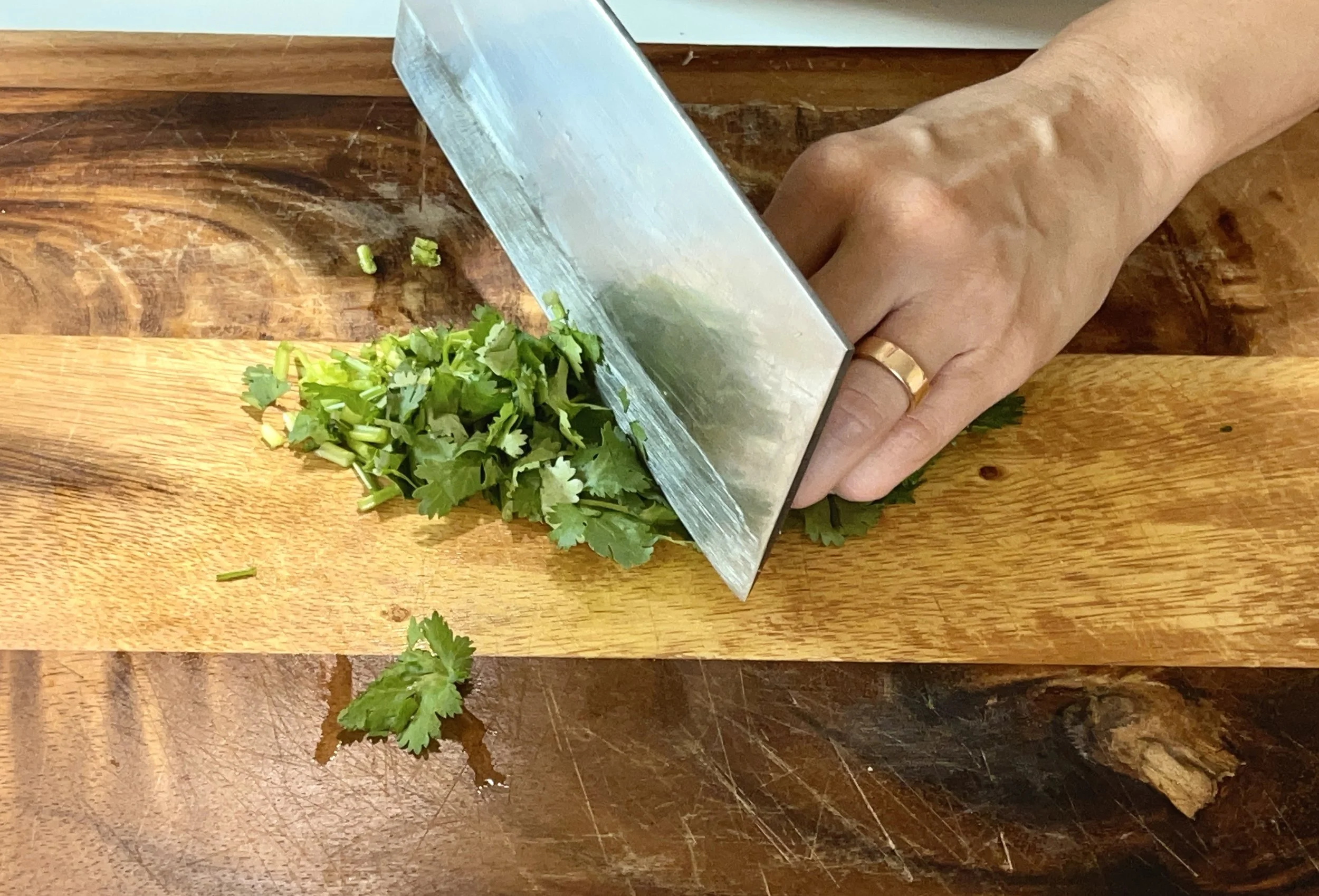 3. Roughly chop cilantro to 2cm long pieces, throwing away the ends and thick stems.