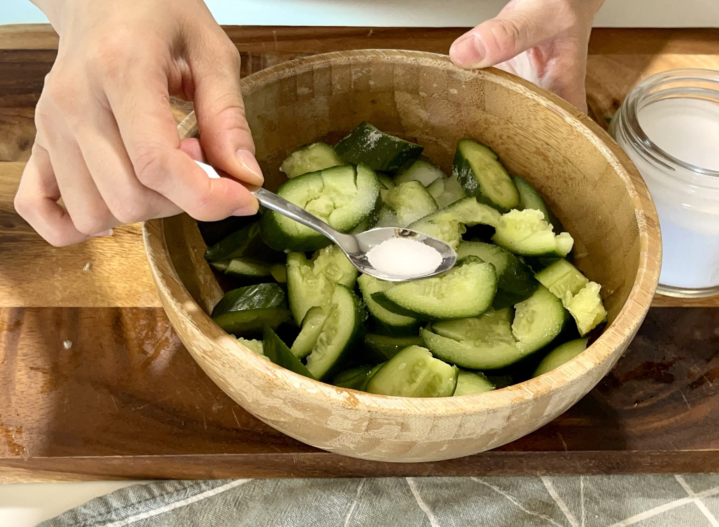 Preserving the bright green color: Put the cut cucumbers into a bowl or plate. Sprinkle ½ teaspoon of salt and mix evenly. Let the cucumbers rest for 10 mins. The salt preserves the bright green color. Salt also help release excessive water. Cucumbers release a lot of water if not consumed right away, but too much water dilutes flavour and reduces crunchiness.